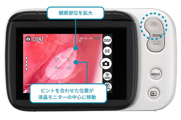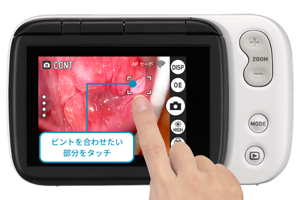 液晶モニターのタッチ操作で観察部位にピントを合わせることができます。