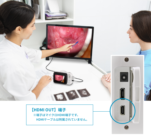 HDMIで大画面モニターやプロジェクターなどに接続すると、撮影中の画像をリアルタイムで映すことができます。また撮影したあとの画像を映すこともできます。患者への説明やカンファレンスなどに便利です。