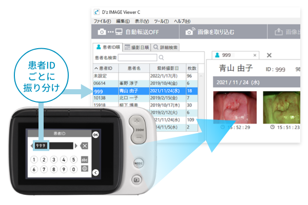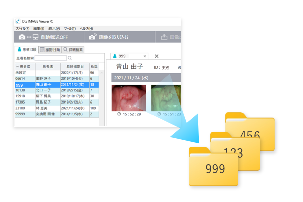 IDを入力して撮影した画像は、D’z IMAGE Viewer Cで自動的にIDごとに振り分けて登録されます。