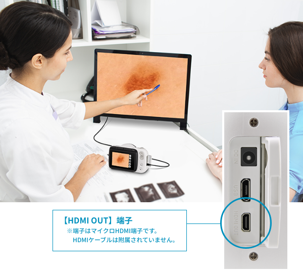 HDMIで大画面モニターやプロジェクターなどに接続すると、撮影中の画像をリアルタイムで映すことができます。また撮影したあとの画像を映すこともできます。患者への説明やカンファレンスなどに便利です。