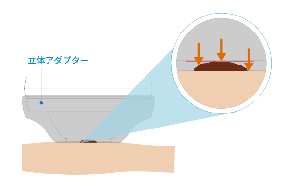 カメラのレンズ部に約2mmのスペースを設けるアダプターです。膨らんだ病変などを押さえつけずに撮影することができます。DERMO AIF(All In Focus)で撮影するのに活用できます。