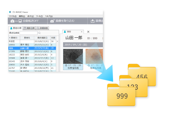 患者IDが紐づけられた画像データを任意のフォルダに出力することができます。
