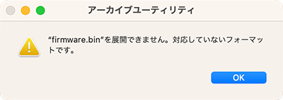 Windowsの場合は、ダウンロードした「DZ-C100_102.exe」をダブルクリックして自己解凍してください。 保存先に指定したフォルダに「firmware.bin」ファイルが作成されますのでご確認ください。 macOS の場合は、ダウンロードした「DZ-C100_102.zip」をダブルクリックして解凍してください。 同じフォルダに「firmware.bin」ファイルが作成されますのでご確認ください。 「firmware.bin」というファイルは下記の3の項目で使用します。 ※macOSで以下の表示が出ることがありますが、問題はありませんのでそのままOKを押して閉じて 「firmware.bin」というファイルがあることをご確認ください。   2.