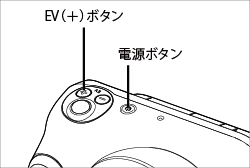 カメラの電源が切れている状態でカメラのEV(+) ボタンを押しながら電源ボタンを長押しします。